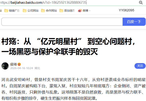 周某庆出狱后持续申诉,2008 年河北省高院裁定原判 “证据不充分” 并指令再审,五位刑法权威专家联名出具意见书,认定判决完全错误。但邯郸中院再审未开庭、未核新证,直接维持原判,申诉陷入程序空转,阻碍正义的力量仍在。如今 75 岁的周某庆仍在奔走,不为赔偿,只为洗清罪名、恢复名誉。坦岭村的悲剧警示:基层黑恶与权力勾连,再扎实的发展成果也会被瞬间吞噬。乡村振兴需要敢干事、能干事的领头人,更需要震慑黑恶及其 “保护伞”、守护集体资产的公平正义。我们呼吁重审这桩沉冤旧案,彻查以武增亲属、司机周强、秦章为首的黑恶势力及其保护伞,追回被侵吞集体资产,还周某庆清白,还坦岭村重生之机。